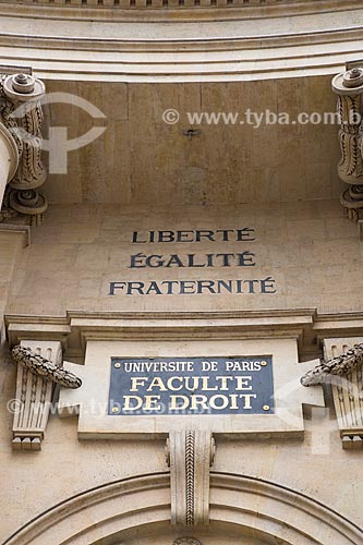 Assunto: Detalhe da inscrição Liberté, Égalité, Fraternité (Liberdade, Igualdade, Fraternidade) na fachada da Faculté de Droit (Faculdade de Direito) da Universidade de Paris / Local: Paris - Paris - França / Data: 06/2016