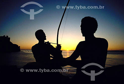 [+] esporte, [+] instrumento musical, [+] silhueta, [+] beira-mar, [+] litoral, [+] atividade física, [+] exercício físico, [+] mar, [+] praia, [+] orla, [+] cultura afro-brasileira, [+] cultura popular, [+] Bahia, [+] musical, [+] capoeira, [+] luta, [+] instrumento de percussão, [+] instrumentos de percussão, [+] berimbau, [+] cor, [+] atividade
