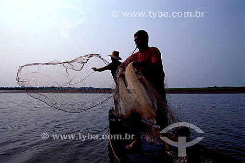 Assunto: Pescadores na canoa jogando a rede de pescar no Lago Mamirauá - AM - Brasil / Local: Tefé - Amazonas - Brasil
