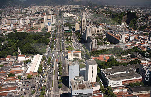 Assunto: Vista aérea do Centro da cidade do Rio de Janeiro, mostrando a Av. Presidente Vargas, com o prédio do Ministério da Guerra, atual Palácio Duque de Caxias com a torre e o relógio da Central do Brasil (Estrada de Ferro Central do Brasil), construída no governo de Getúlio Vargas em estilo art déco à direita - RJ - Brasil foto digital / Local: Centro - Rio de Janeiro - Rio de Janeiro - Brasil