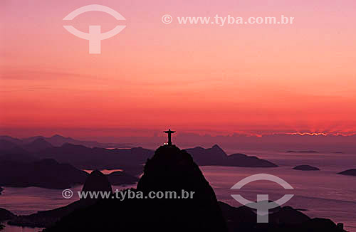 Cristo Redentor ao pôr-do-sol com o Pão de Açúcar ao fundo - Rio de Janeiro - RJ - Brasil / Data: 03/1999