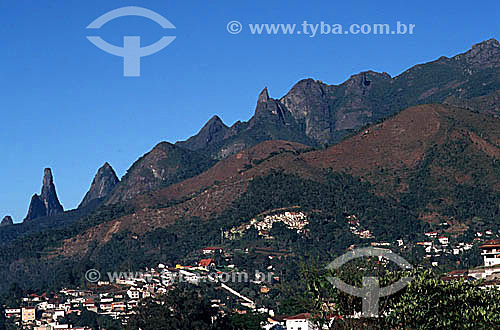 Assunto: Vista da cidade de Teresópolis com a silhueta do relevo montanhoso do Parque Nacional da Serra dos Órgãos ao fundo, no qual se destaca o Dedo de Deus à esquerda, pico assim denominado por sugerir a forma de um dedo indicador apontado para o céu - Teresópolis - Região serrana do estado do Rio de Janeiro - Brasil / Local: Teresópolis - Rio de Janeiro - Brasil