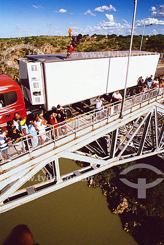 [+] gente, [+] pessoa, [+] Região Sudeste, [+] esporte, [+] ponte, [+] infraestrutura, [+] atividade física, [+] aventura, [+] esporte radical, [+] esporte aéreo, [+] estrutura metálica, [+] caminhão, [+] Bahia, [+] Rio São Francisco, [+] paraquedismo, [+] paraquedista, [+] cor