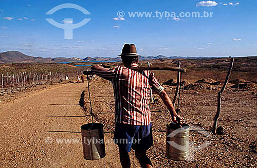 Assunto: Homem carregando baldes de água durante a seca / Local: Orós - Ceará - Brasil / Data: 01/2004