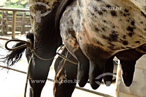 Vaca amarrada pronta para ser ordenhada - Fazendas próximas a São Fidélis - Rio de Janeiro - Brasil Data: 01/12/2006