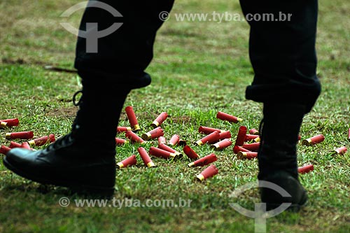 Assunto: Detalhe de botades de policial civil com cartuchos de escopeta no chão a sua volta / Local: Estande de tiro da polícia civil - Cajú - Rio de Janeiro - RJ / Data: 09/2008