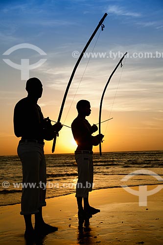 [+] gente, [+] pessoa, [+] esporte, [+] silhueta, [+] entardecer, [+] litoral, [+] cultura, [+] crepúsculo, [+] atividade física, [+] exercício físico, [+] praia, [+] por do sol, [+] cultura afro-brasileira, [+] dança, [+] Região Nordeste, [+] Parque Nacional de Jericoacoara, [+] berimbau, [+] cor