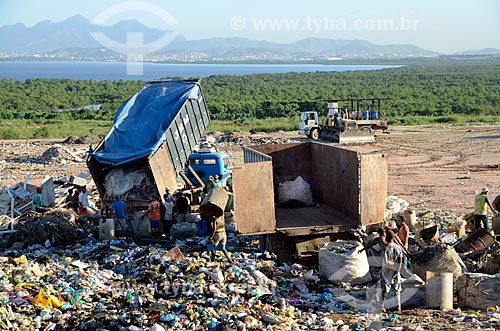 Assunto: Trabalhadores aguardando o descarregamento de caminhão de lixo enquanto outros enchendo um caminhão com sacos de coleta seletiva, no Aterro Sanitário de Jardim Gramacho - Ao fundo a cidade do Rio de Janeiro / Local: Duque de Caxias - Rio de Janeiro - Brasil / Data: 04/2011