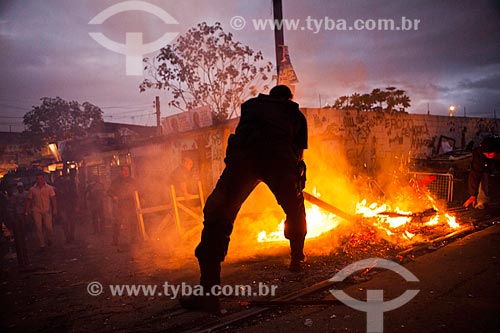 Assunto: Policial apagando uma fogueira durante a ocupação no conjunto de favelas do Jacarezinho e Manguinhos para implantação da Unidade de Policia Pacificadora (UPP) / Local: Rio de Janeiro (RJ) - Brasil / Data: 10/2012