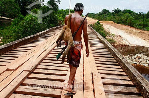 Assunto: Homem carregando animal abatido durante a caça / Local: Amazonas (AM) - Brasil / Data: 10/2013