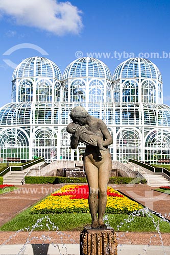 Assunto: Escultura Amor Materno no Jardim Botânico de Curitiba (Jardim Botânico Francisca Maria Garfunkel Rischbieter) com a estufa ao fundo / Local: Jardim Botânico - Curitiba - Paraná (PR) - Brasil / Data: 12/2013
