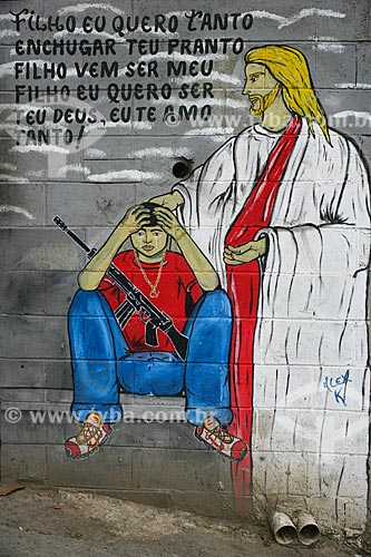 [+] Região Sudeste, [+] comunidade, [+] favela, [+] imagem religiosa, [+] habitação, [+] religiosidade, [+] grafite, [+] parede, [+] espiritualidade, [+] zona norte, [+] muro, [+] fé, [+] arma, [+] Violência, [+] periferia, [+] violência urbana, [+] Jesus Cristo, [+] armamento, [+] Complexo do Alemão, [+] desenho, [+] arte de rua, [+] arte urbana, [+] arma de fogo