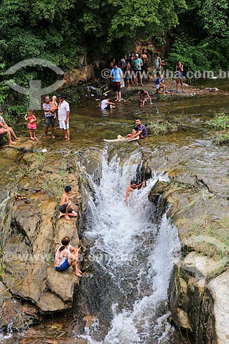 [+] gente, [+] homem, [+] pessoa, [+] adulto, [+] natureza, [+] mulher, [+] rocha, [+] criança, [+] formação rochosa, [+] banhista, [+] cascata, [+] Região Nordeste, [+] Piauí, [+] açude, [+] Açude Caldeirão