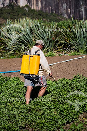 Assunto: Homem aplicando o inseticida folidol em plantação de hortelã sem equipamento de proteção / Local: Correas - Petrópolis - Rio de Janeiro (RJ) - Brasil / Data: 09/2014