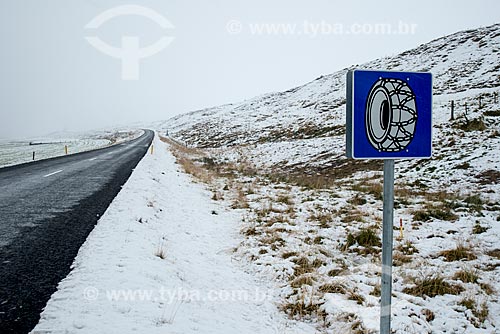 Assunto: Placa na Ring road - principal estrada da Islândia - indicando o uso de correntes nos pneus / Local: Northeastern Region - Islândia / Data: 09/2014