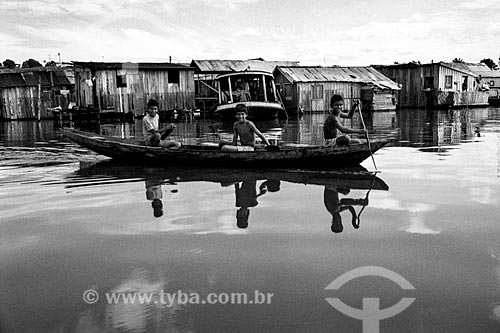 Assunto: Meninos em canoa durante cheia do Rio Negro / Local: Amazonas (AM) - Brasil / Data: 01/1985