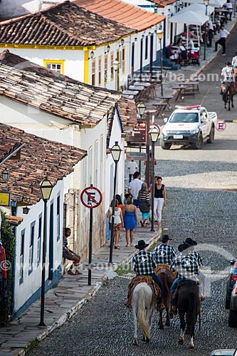 Assunto: Homens à cavalo na Rua do Rosário - chegando para a cavalgada de envio da Folia de Reis / Local: Pirenópolis - Goiás (GO) - Brasil / Data: 05/2015