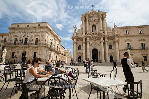 Assunto: Mesas de cafeteria na Piazza del Duomo (Praça do Duomo) com a Cattedrale Metropolitana della Natività di Maria Santissima (Catedral Metropolitana da Natividade de Maria Santíssima) - 1753 - ao fundo / Local: Siracusa - Província de Siracusa - Itália / Data: 10/2015