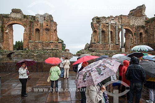 [+] gente, [+] pessoa, [+] multidão, [+] arquitetura, [+] turismo, [+] cultura, [+] turista, [+] arquitetura histórica, [+] construção histórica, [+] Itália, [+] guarda-chuva, [+] Europa, [+] exterior, [+] ruína, [+] arqueologia, [+] Sítio Arqueológico, [+] molhado, [+] sombrinha, [+] Sicília, [+] Antigo Teatro de Taormina, [+] século 2, [+] Teatro Antico di Taormina