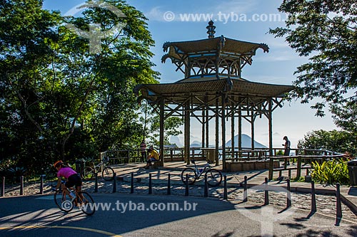 Assunto: Ciclista na estrada da Vista Chinesa com o Mirante da Vista Chinesa / Local: Alto da Boa Vista - Rio de Janeiro - Rio de Janeiro (RJ) - Brasil / Data: 02/2016