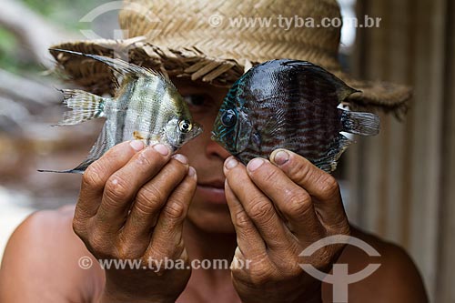 Assunto: Detalhe de ribeirinho segurando Acará-Bandeira (Pterophyllum scalare) e Acará-Disco Hekel (Symphysodon discus) no Rio Negro / Local: Barcelos - Amazonas (AM) - Brasil / Data: 03/2016