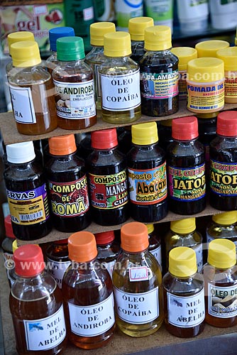 Assunto: Garrafas com compostos e óleos à venda no Mercado Municipal Adolpho Lisboa (1883) / Local: Manaus - Amazonas (AM) - Brasil / Data: 10/2015