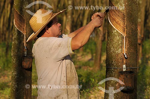 Assunto: Seringueiro riscando tronco da seringueira para extração do látex / Local: União Paulista - São Paulo (SP) - Brasil / Data: 07/2016