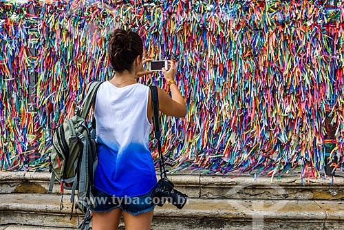 Assunto: Mulher fotografando as fitinhas coloridas nas grades da Igreja de Nosso Senhor do Bonfim (1754) / Local: Bonfim - Salvador - Bahia (BA) - Brasil / Data: 10/2016