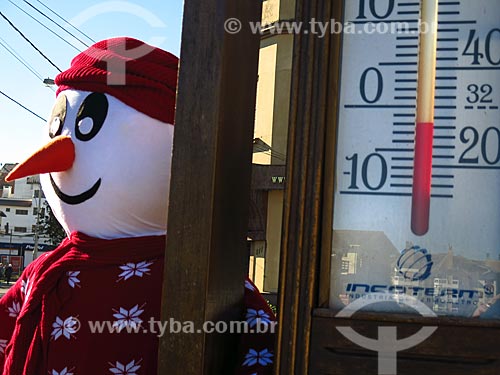 Assunto: Detalhe de decoração de inverno e termômetro marcando abaixo de zero na serra gaúcha / Local: Canela - Rio Grande do Sul (RS) - Brasil / Data: 07/2017