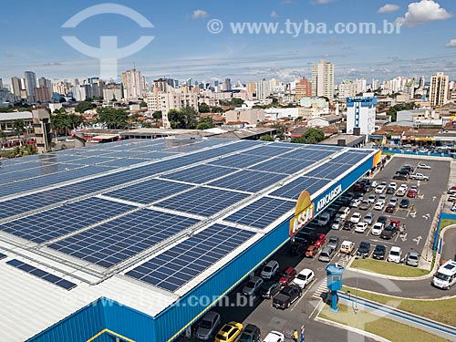 Assunto: Foto feita com drone de painéis solares fotovoltaicos no telhado do Assaí Atacadista / Local: Goiânia - Goiás (GO) - Brasil / Data: 04/2018