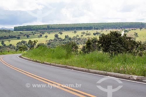 Assunto: Vista da Rodovia GO-164 - entre a cidade de Goiás e Mossâmedes - com plantação de eucalipto ao fundo / Local: Goiás - Goiás (GO) - Brasil / Data: 04/2018