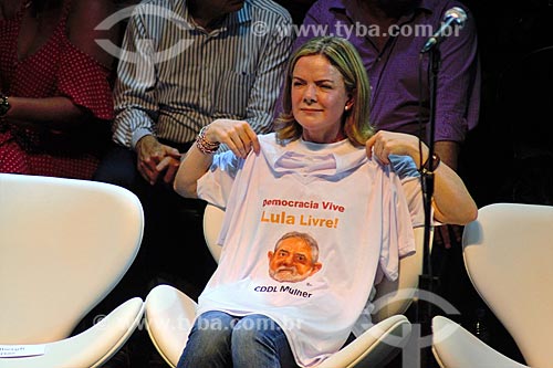 Assunto: Gleisi Hoffmann segurando camisa com os dizeres: Lula Livre durante ato em defesa da democracia com o ex-presidente Luiz Inácio Lula da Silva no Circo Voador / Local: Lapa - Rio de Janeiro - Rio de Janeiro (RJ) - Brasil / Data: 04/2018