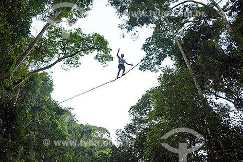 Assunto: Praticante de slackline na Parque Nacional da Tijuca próximo à Cachoeira do Box no Horto / Local: Tijuca - Rio de Janeiro - Rio de Janeiro (RJ) - Brasil / Data: 05/2018