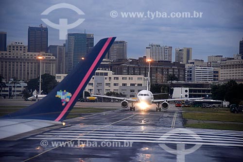 Assunto: Avião na pista do Aeroporto Santos Dumont (1936) com prédios do centro do Rio de Janeiro ao fundo / Local: Centro - Rio de Janeiro - Rio de Janeiro (RJ) - Brasil / Data: 12/2017