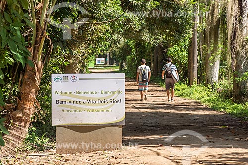 Assunto: Placa com os dizeres: Bem vindo a Vila de Dois Rios com jovens ao fundo andando na estrada de terra / Local: Distrito Ilha Grande - Angra dos Reis - Rio de Janeiro (RJ) - Brasil / Data: 09/2018