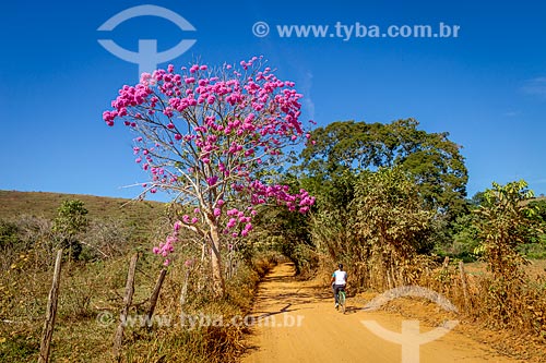Assunto: Mulher andando de bicicleta em estrada de terra na zona rural da cidade de Guarani com Ipê Rosa (Tabebuia heptaphylla) / Local: Guarani - Minas Gerais (MG) - Brasil / Data: 07/2019