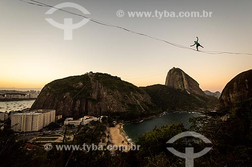Assunto: Praticante de slackline com o Pão de Açúcar ao fundo durante o pôr do sol / Local: Urca - Rio de Janeiro - Rio de Janeiro (RJ) - Brasil / Data: 08/2019