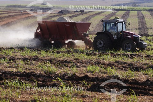 Assunto: Trator fazendo adubando solo para plantio de cana-de-açúcar / Local: Pereira Barreto - São Paulo (SP) - Brasil / Data: 07/2022
