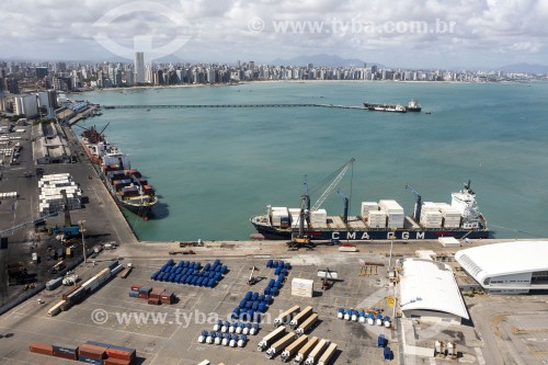 [+] porto, [+] região nordeste, [+] transporte marítimo, [+] transporte, [+] infraestrutura, [+] embarcação, [+] mar, [+] paisagem, [+] zona portuária, [+] ancorado, [+] aérea, [+] contêiner, [+] Ceará, [+] foto aérea, [+] vista aérea, [+] carga, [+] navio cargueiro, [+] transporte de carga, [+] atracado, [+] navio