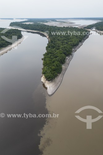 Assunto: Foto feita com drone do encontro de águas escuras e lamacentas no Rio Negro durante seca severa na Amazônia - Parque Nacional de Anavilhanas / Local: Manaus - Amazonas (AM) - Brasil / Data: 10/2023