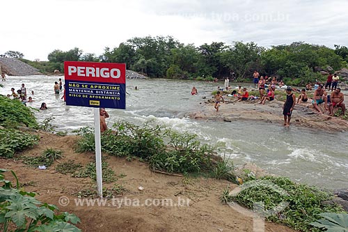 •  Pessoas tomando banho no Rio Paraíba - Projeto de Integração do Rio São Francisco - com placa de aviso que diz: Perigo não se aproxime, mantenha distância, risco de afogamento  - Monteiro - Paraíba (PB) - Brasil