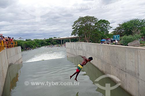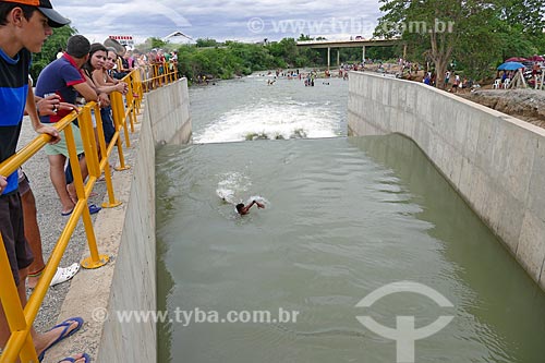 Homem saltando no vertedouro que despeja água no Rio Paraíba - Projeto de Integração do Rio São Francisco - Monteiro - Paraíba (PB) - Brasil