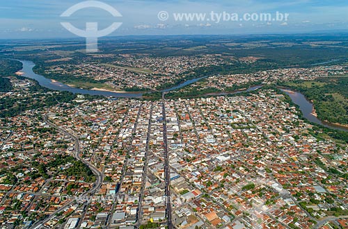 Foto feita com drone da cidade de Barra do Garças com a ponte na Rodovia BR-070 e as cidades de Pontal do Araguaia e Aragarças ao fundo - divisa natural entre Mato Grosso e Goiás - Barra do Garças - Mato Grosso (MT) - Brasil