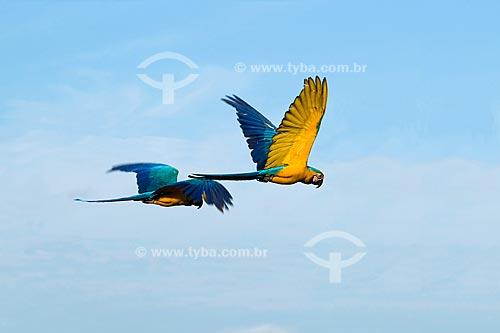Assunto: Casal de araras-canindé (Ara ararauna) em vôo no Parque Nacional das Emas - Pantanal / Local: Parque Nacional das Emas - Mineiros - Goiás (GO) / Data: Outubro de 2008