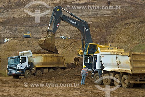 Escavadeira carregando caminhões em mina de fosfato - usado para a produção de fertilizantes - Araxá - Minas Gerais (MG) - Brasil