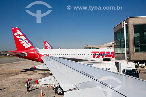 •  Detalhe de asa de avião com aviões da TAM Linhas Aéreas ao fundo no Aeroporto de Congonhas (1936)  - São Paulo - São Paulo (SP) - Brasil
