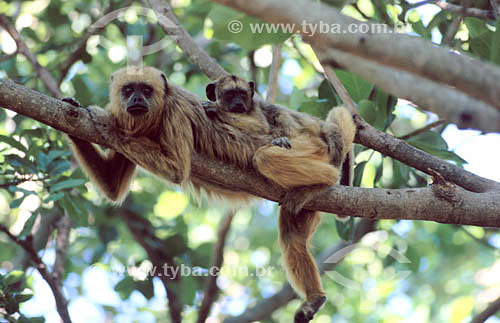 Bugio-preto (louatta caraya) com filhote - Refúgio Caiman - Miranda - Mato Grosso do Sul (MS) - Brasil