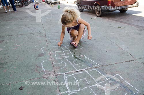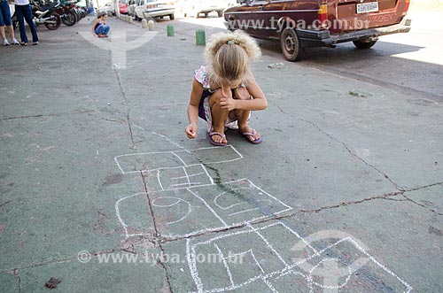 •  Assunto: Menina desenhando amarelinha em frente ao Mercado do Porto / Local: Cuiabá - Mato Grosso (MT) - Brasil / Data: 07/2013