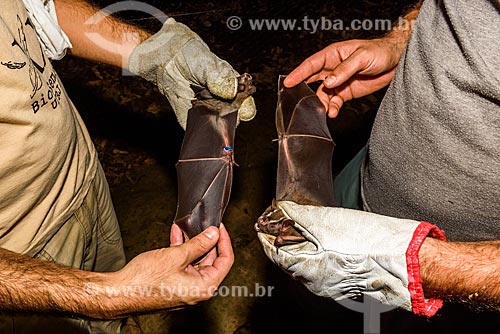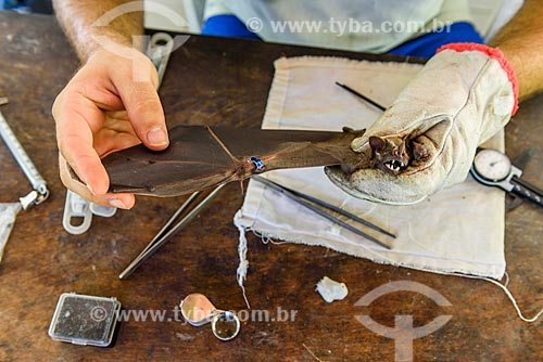 Detalhe de anilhamento de morcego (Chiroderma doriae) na Reserva Ecológica de Guapiaçu - Cachoeiras de Macacu - Rio de Janeiro (RJ) - Brasil