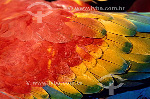 (Ara macao) - Detalhe de plumagem de pássaro - Araracanga, Arara-canga, Arara-pitanga, Arara-vermelha-pequena - Amazônia - Brasil